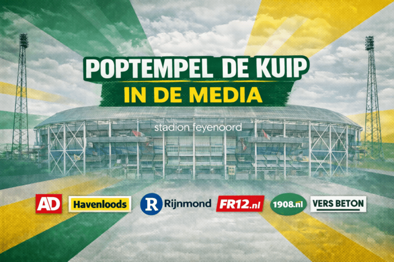 Poptempel De Kuip zet zich in om grote concerten terug te brengen naar De Kuip. Om dat doel dichterbij te brengen, volgen we wat er in de media over dit onderwerp verschijnt. Op deze pagina verzamelen we relevante artikelen, reportages en interviews. Daarnaast zoeken we zelf actief de media op. Want hoe vaker het onderwerp opduikt in kranten, op websites en op radio en tv, hoe sterker het geluid dat concerten weer thuishoren in De Kuip.