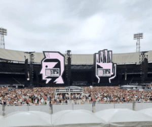 Het concert begon met een eerbetoon aan de rijke concertgeschiedenis van het stadion. Op de grote schermen flitsten beelden van muzikale legendes voorbij: Bob Dylan (1978), Tina Turner, The Rolling Stones, David Bowie, Metallica – stuk voor stuk grootheden die de heilige grond van De Kuip ooit betraden. De tonen van Dylans Like a Rolling Stone galmden over de tribunes, als opmaat naar een bijzondere avond. De opkomst van DI-Rect was een spektakel op zich. Onder de klanken van You’ll Never Walk Alone verschenen ze, dwars door het publiek, vanaf de andere kant van het stadion. Een korte groepshug en toen barstte het los met 90s Kid (Part 2).
